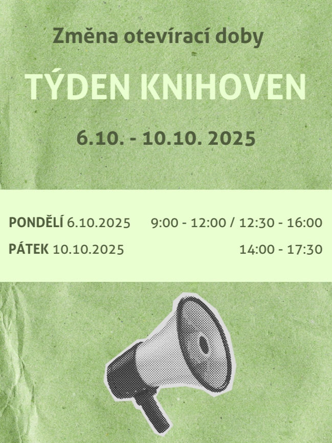 V rámci akce TÝDEN KNIHOVEN bude z důvodu konání akcí upravena otevírací doba oddělení pro dospělé: PONDĚLÍ 6.10.2025 9:00 - 12:00 / 12:30 - 16:00 PÁTEK 10.10.2025 zavřeno / 14:00 - 17:30 Děkujeme za pochopení