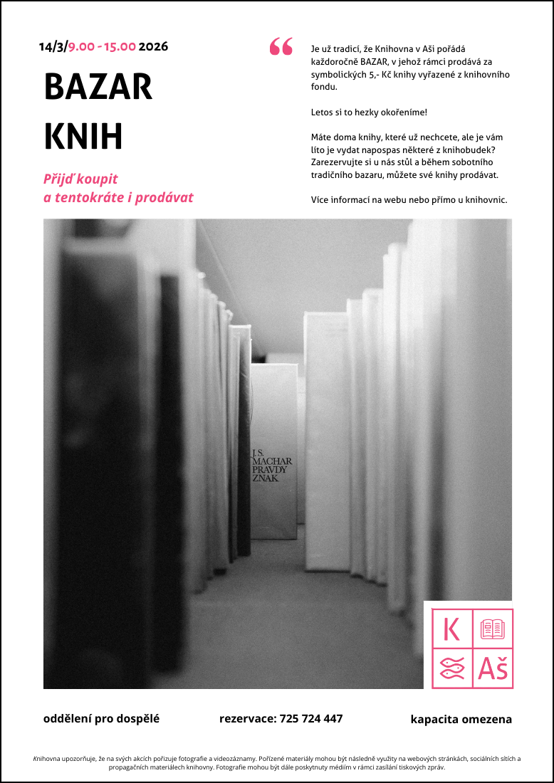 Je už tradicí, že Knihovna v Aši pořádá každoročně BAZAR, v jehož rámci prodává za symbolických 5,- Kč knihy vyřazené z knihovního fondu.