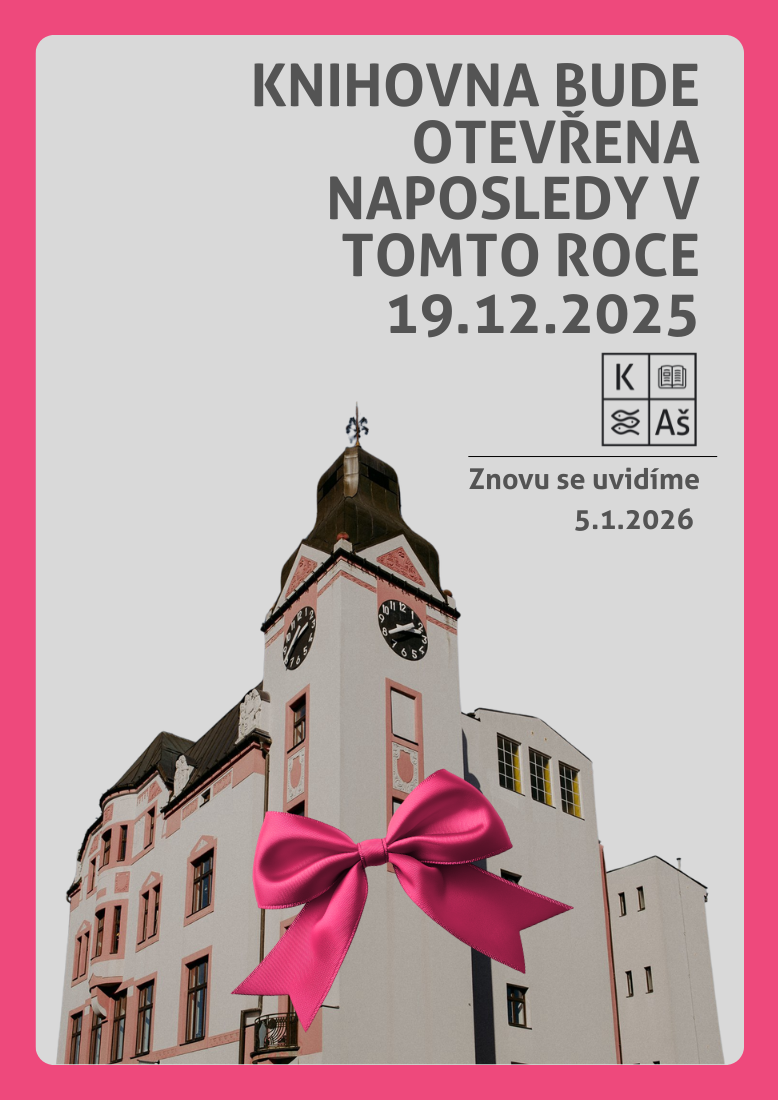 Knihovna bude v tomto roce pro veřejnost naposledy otevřena 19.12.2025. Poté se její dveře na dva týdny uzavřou a znovu se na vás budeme těšit 5.1.2026.
